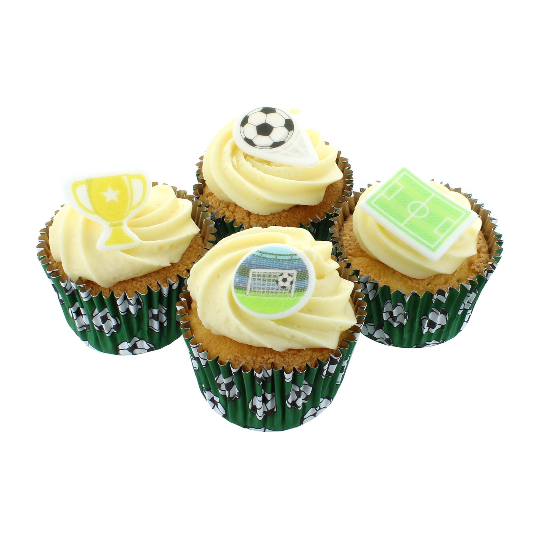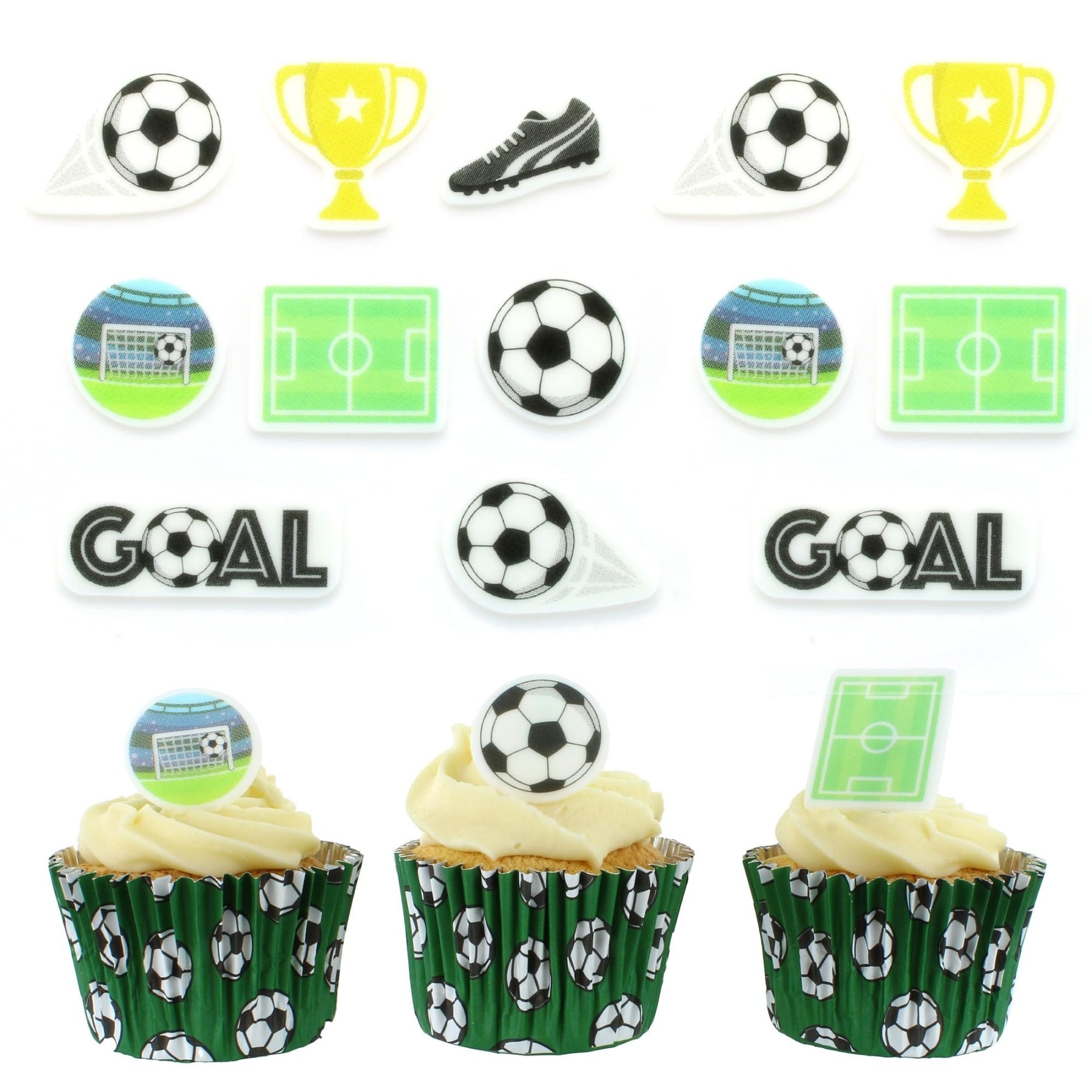 - 32 edible football-themed decorations including footballs, gold trophies, boots, goals, pitch, and 'GOAL' motto