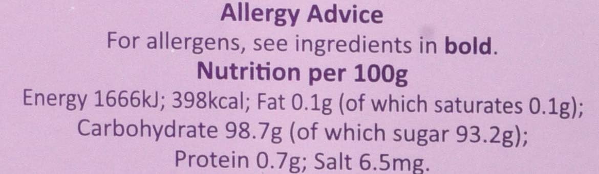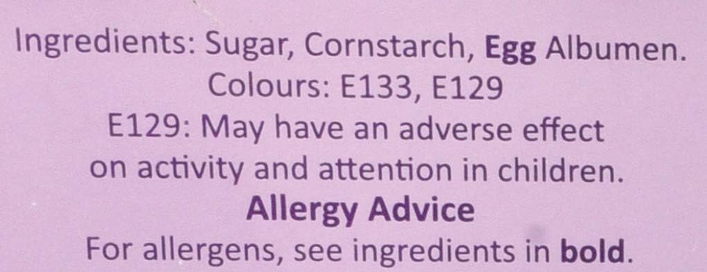 - Ingredients: Sugar, cornstarch, powdered EGG albumen, colours (E133, E129)
