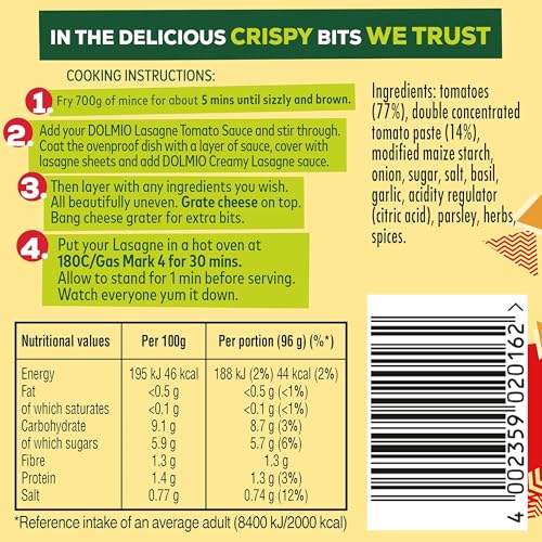- Can be paired with Dolmio Creamy White Lasagne Sauce for a layered, crispy finish