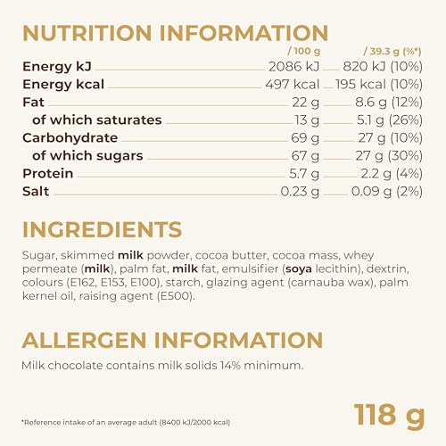 - Ingredients: Sugar, Skimmed MILK Powder, Cocoa Butter, Cocoa Mass, Palm Fat, MILK Fat, LACTOSE, Whey Permeate (from MILK), Emulsifier (SOYA Lecithin), Dextrin, Natural Colours (Curcumin, Vegetable Carbon, Beetroot Red), Starch, Glazing Agent (Carnauba Wax), Palm Kernel Oil, Vanilla Extract
