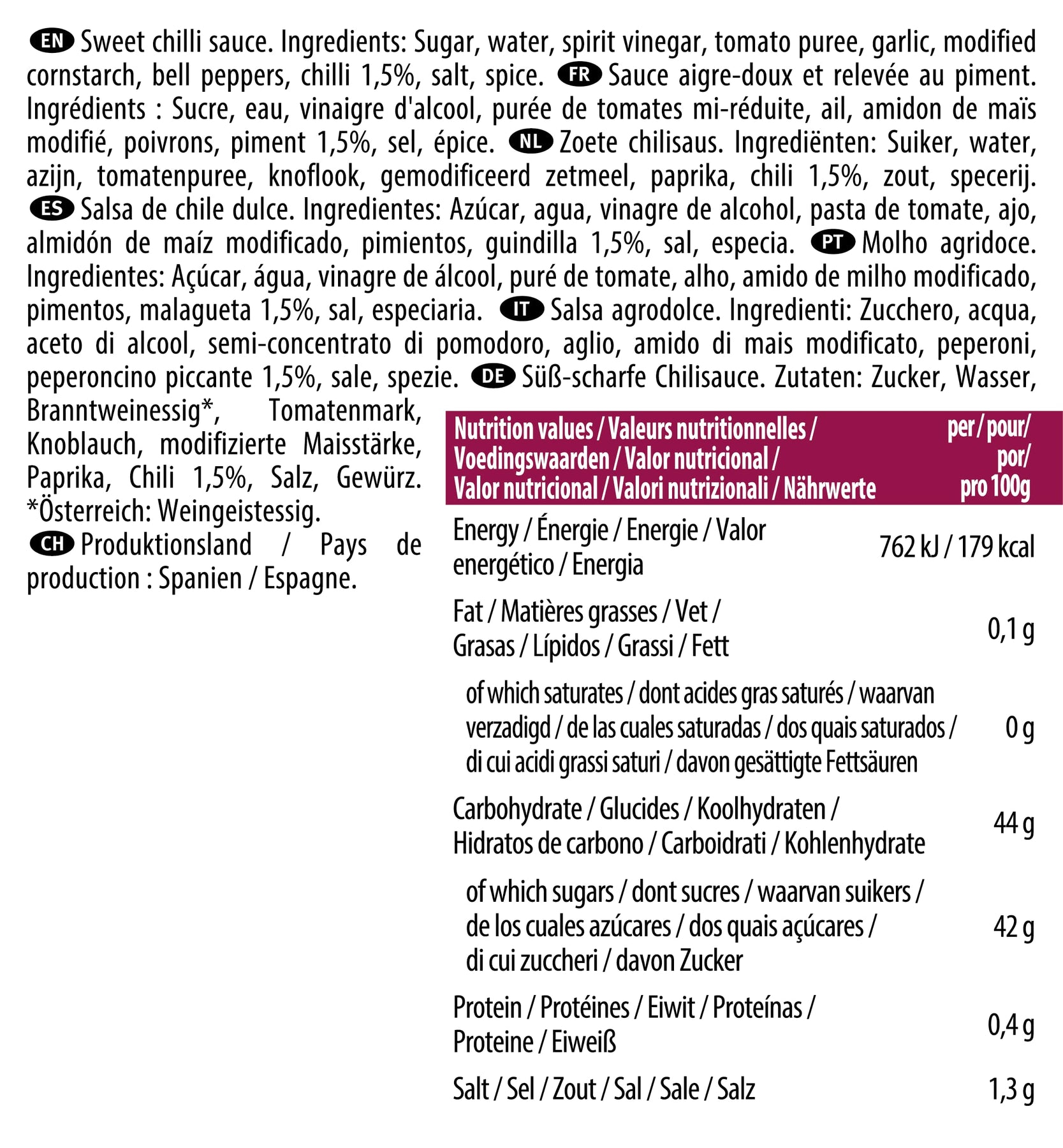 • Ingredients: Sugar, Water, Spirit Vinegar, Tomato Puree, Garlic, Modified Cornstarch, Bell Peppers, Chilli (1.5%), Salt, Spice