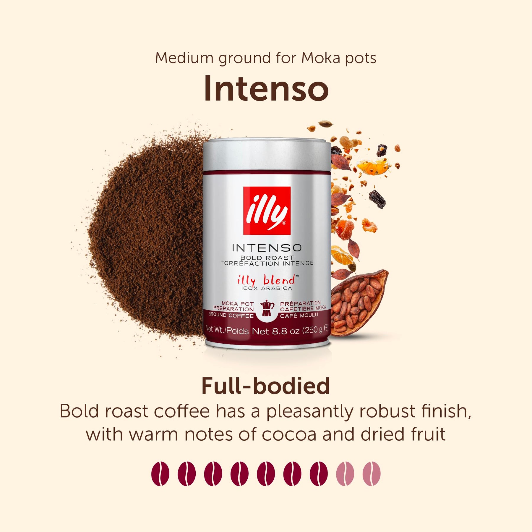 Experience the bold richness of illy Intenso Ground Coffee, a dark roast crafted for those who appreciate a full-bodied and robust coffee experience. Specially formulated for moka pot stovetop preparation, this 100% Arabica coffee delivers a smooth, intense flavour with warm notes of cocoa and dried fruit, embodying the authentic Italian coffee tradition.