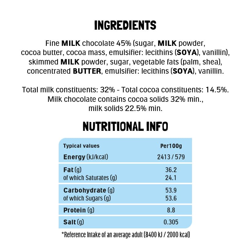 - Contains 45% fine milk chocolate: sugar, milk powder, cocoa butter, cocoa mass, emulsifier (soya), vanillin