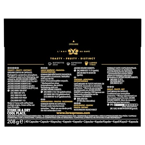 Compatible with both L'OR Barista and Nespresso machines, these recyclable capsules offer a premium coffee experience at home. Store in a cool, dark place away from sunlight and extreme temperatures to maintain freshness. Not suitable for children. Individuals who are pregnant, breastfeeding, sensitive to caffeine, or have heart conditions should consult a healthcare provider before consumption.