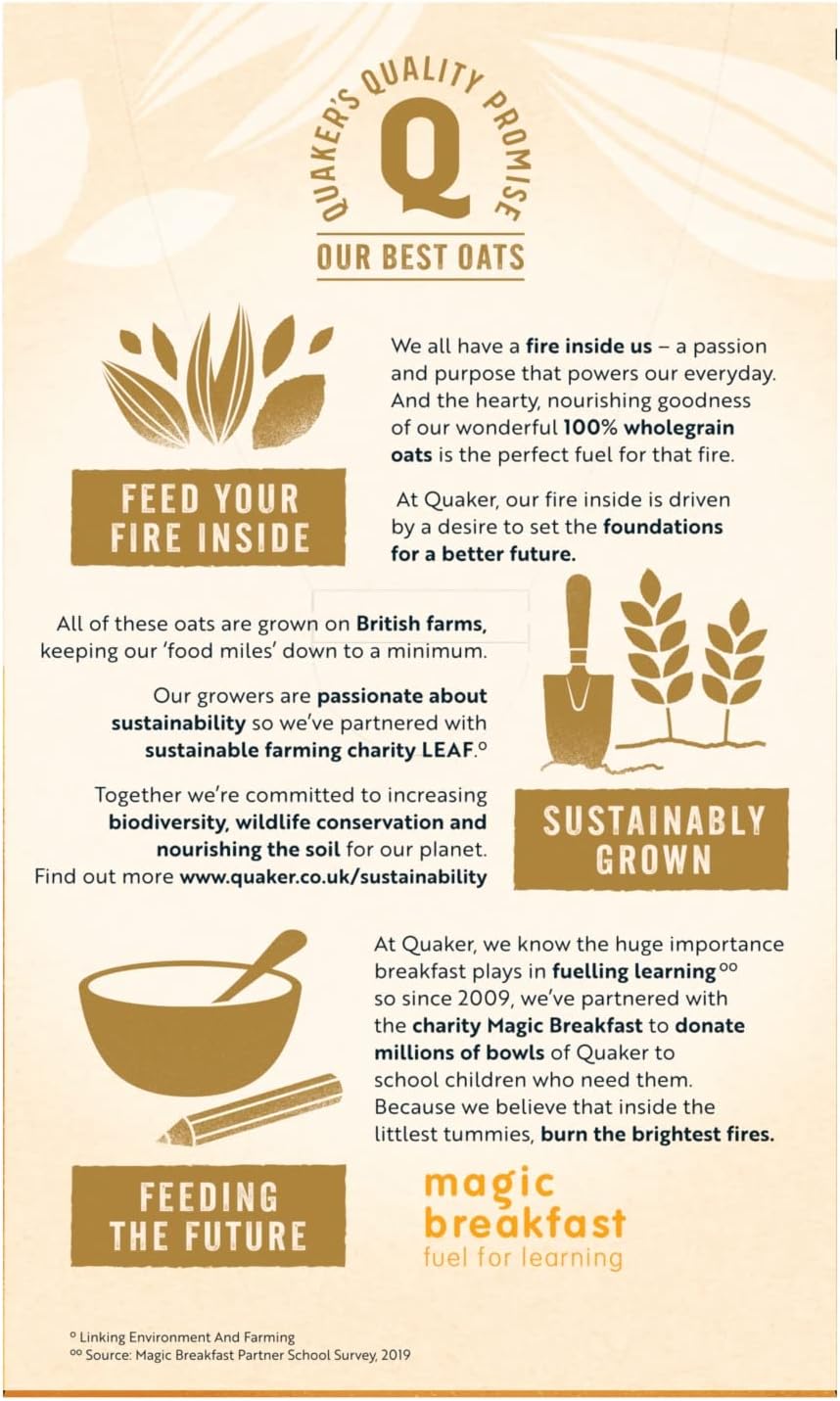 - Ingredients: Quaker Wholegrain Rolled Oats (65%), Soy Protein (16%), Sugar, Salt, Natural Flavourings