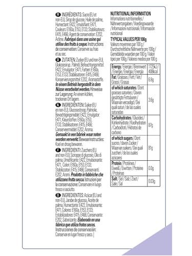 - Ingredients: Sugar (EU and non-EU), Glucose syrup, Palm oil, Humectant: E422, Emulsifier: E471, Colours: E160a, E153, E133; Stabilisers: E415, E466; Preservative: E202, Flavouring