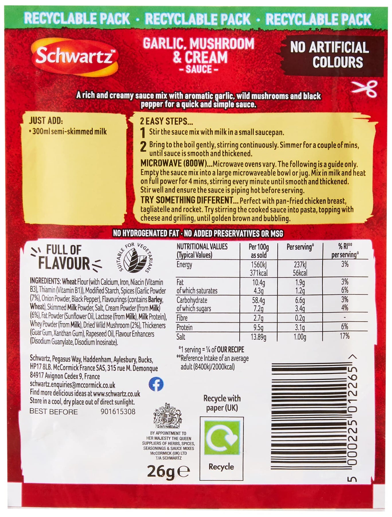 Schwartz Garlic Mushroom & Cream Sauce Mix 26g | Pack of 12 | No Artificial Ingredients