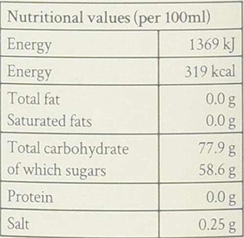 • Ingredients: Sugar, Water, Glycerine, Natural Flavouring, Colour: E150a, Salt, Preservative: E202, Acid: Citric acid