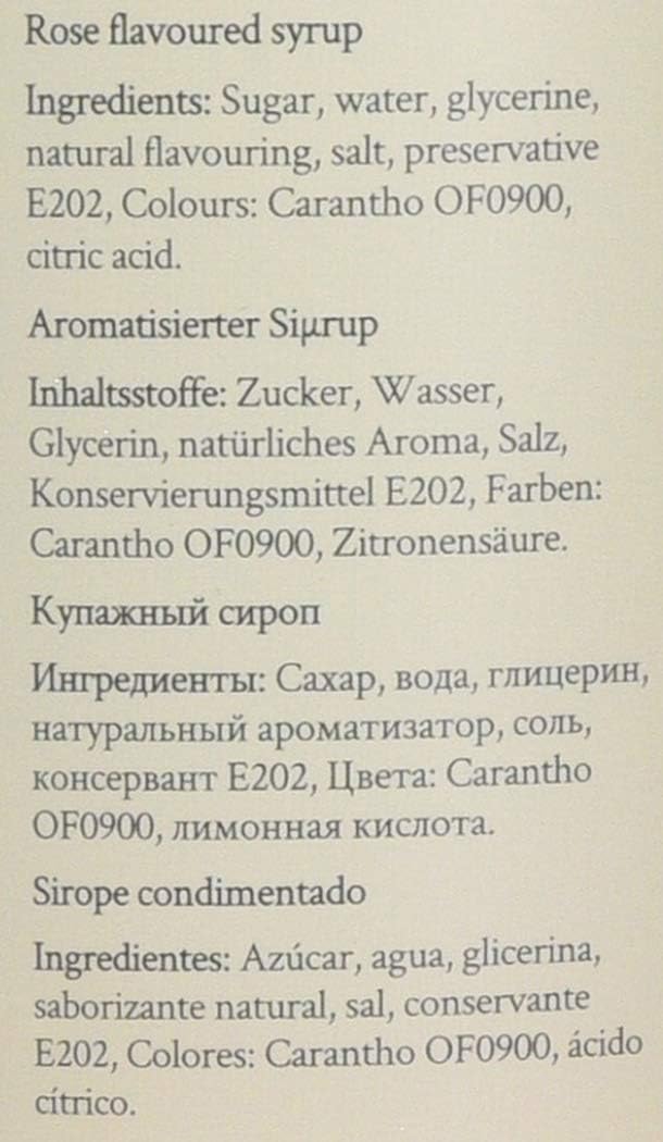 - Ingredients: Sugar, Water, Glycerine, Natural flavouring, Salt, Preservative E202, Colours: Carantho OF0900, Citric acid