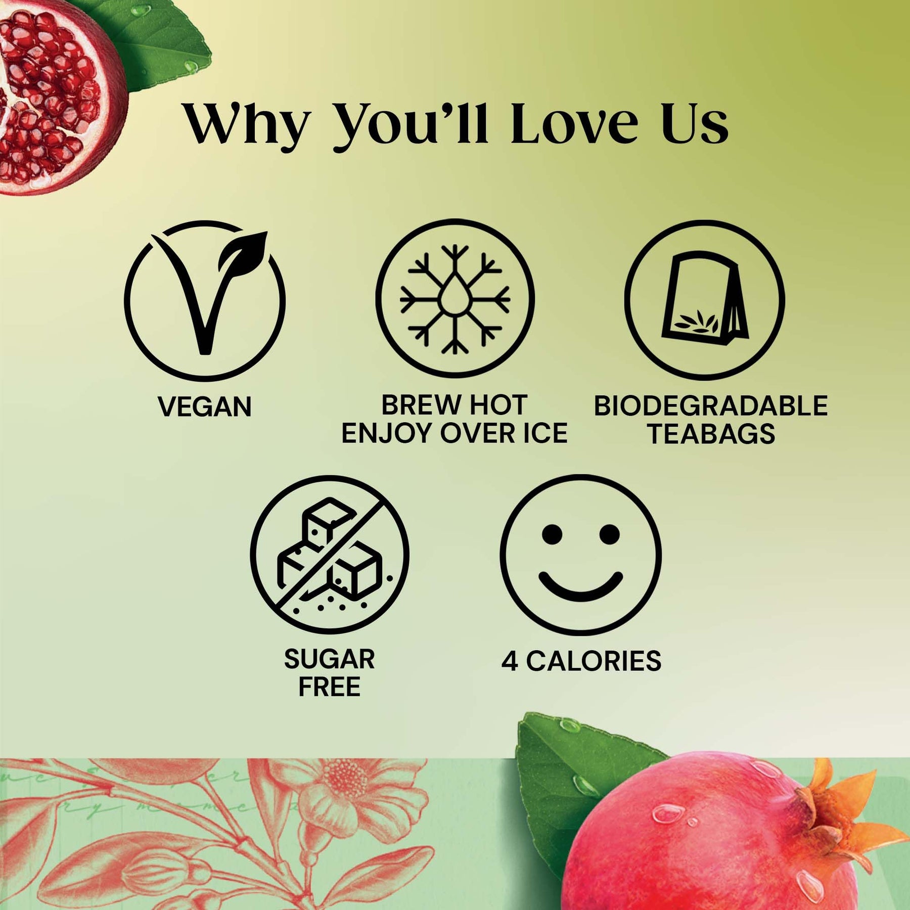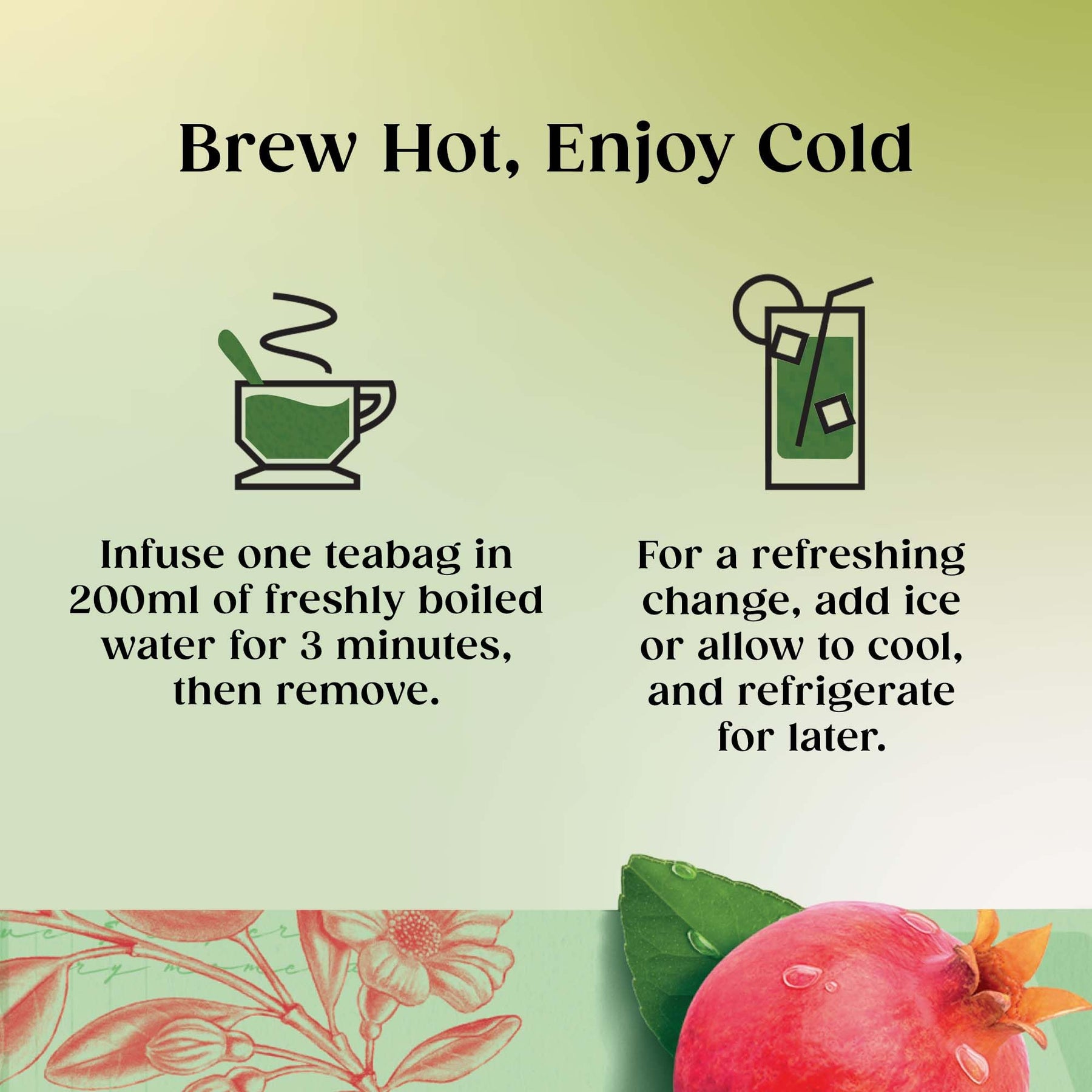 A refreshing and delicately balanced blend, Twinings Green Tea with Pomegranate offers a vibrant taste experience with sharp yet sweet notes of deep pink pomegranate. Sourced with care, this tea combines the natural richness of green tea and the fruity essence of pomegranate, both believed to have originated in southwest China. For optimal flavor, brew for no more than 2 minutes using one tea bag per person, with water that has been boiled and slightly cooled.
