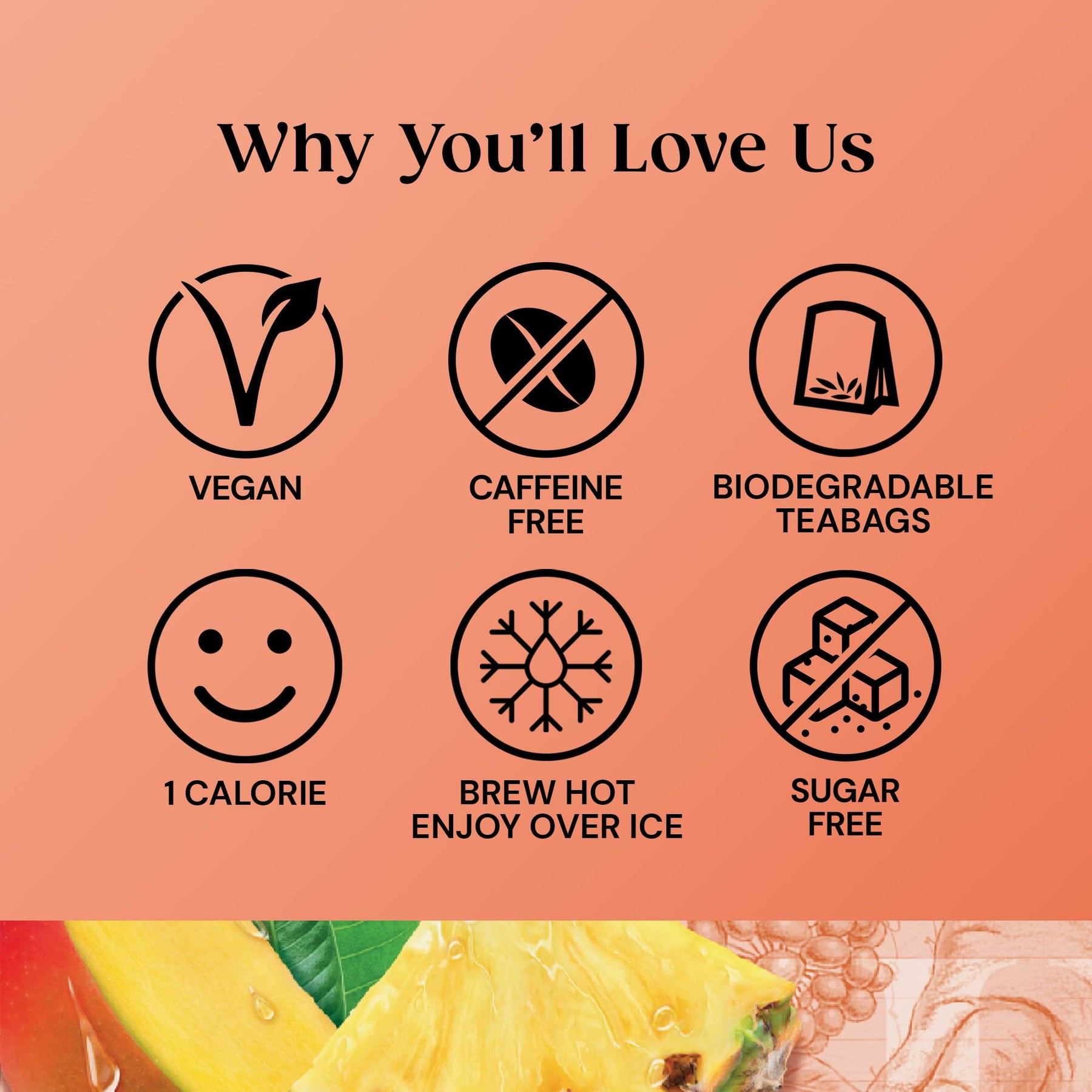 • Flavor profile of sweet mango and tart pineapple with hibiscus, spearmint, and lemon verbena