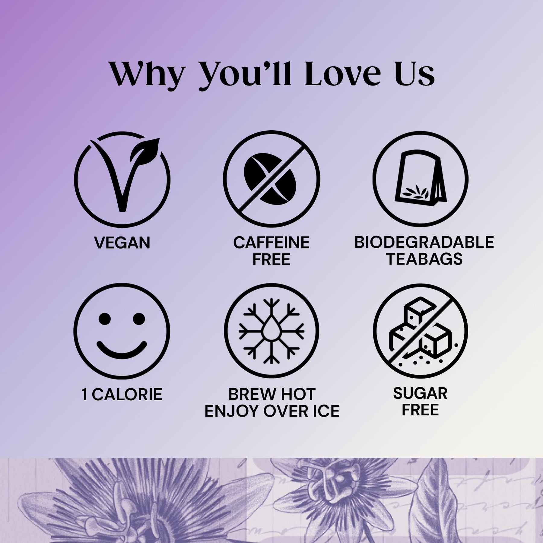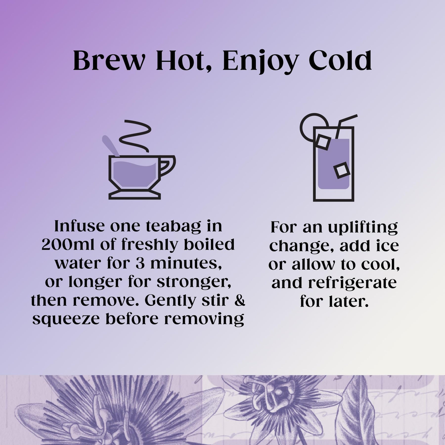 • Herbal tea infusion with passionflower (35%) and camomile to help you wind down
