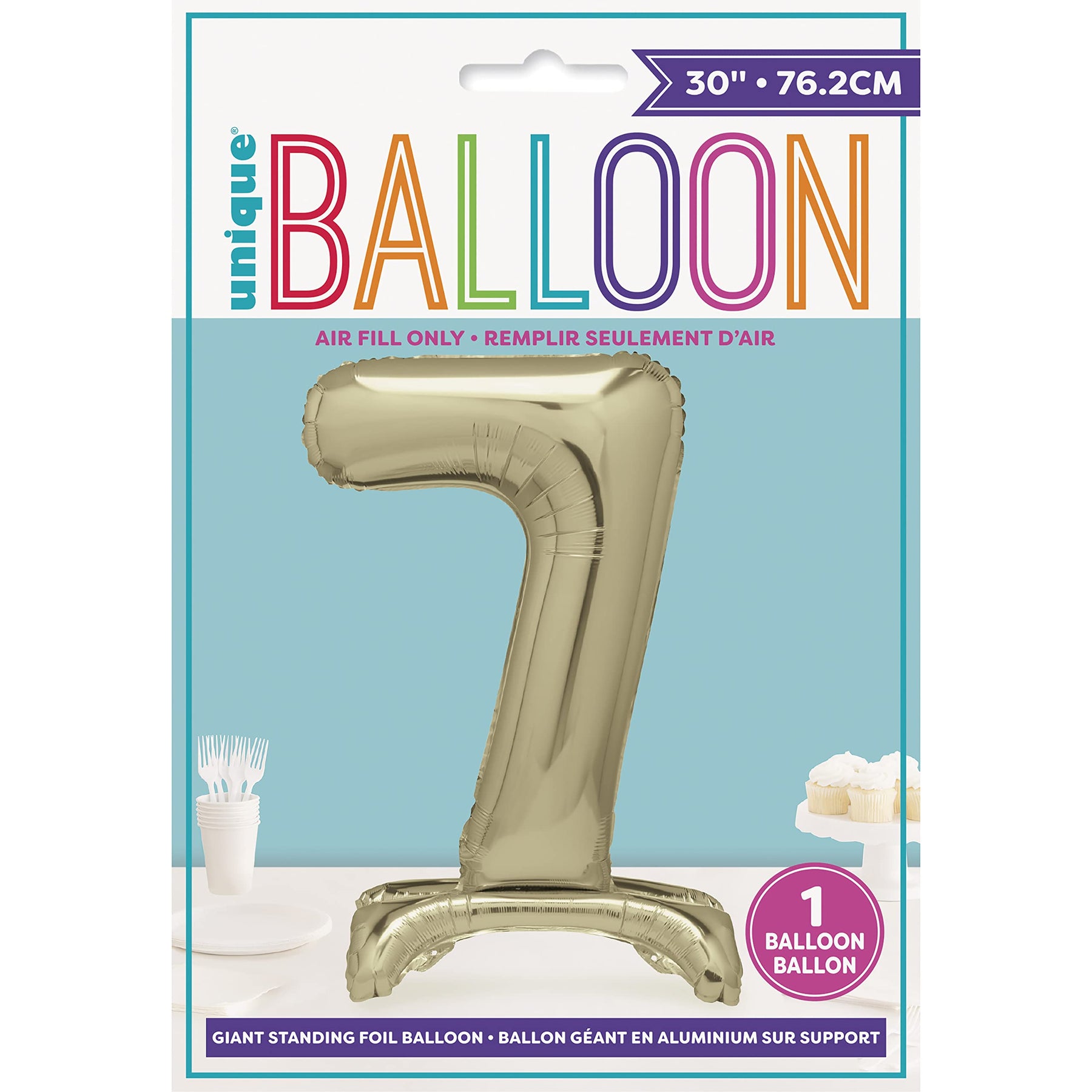 • Giant gold number 7 shaped standing balloon for eye-catching display