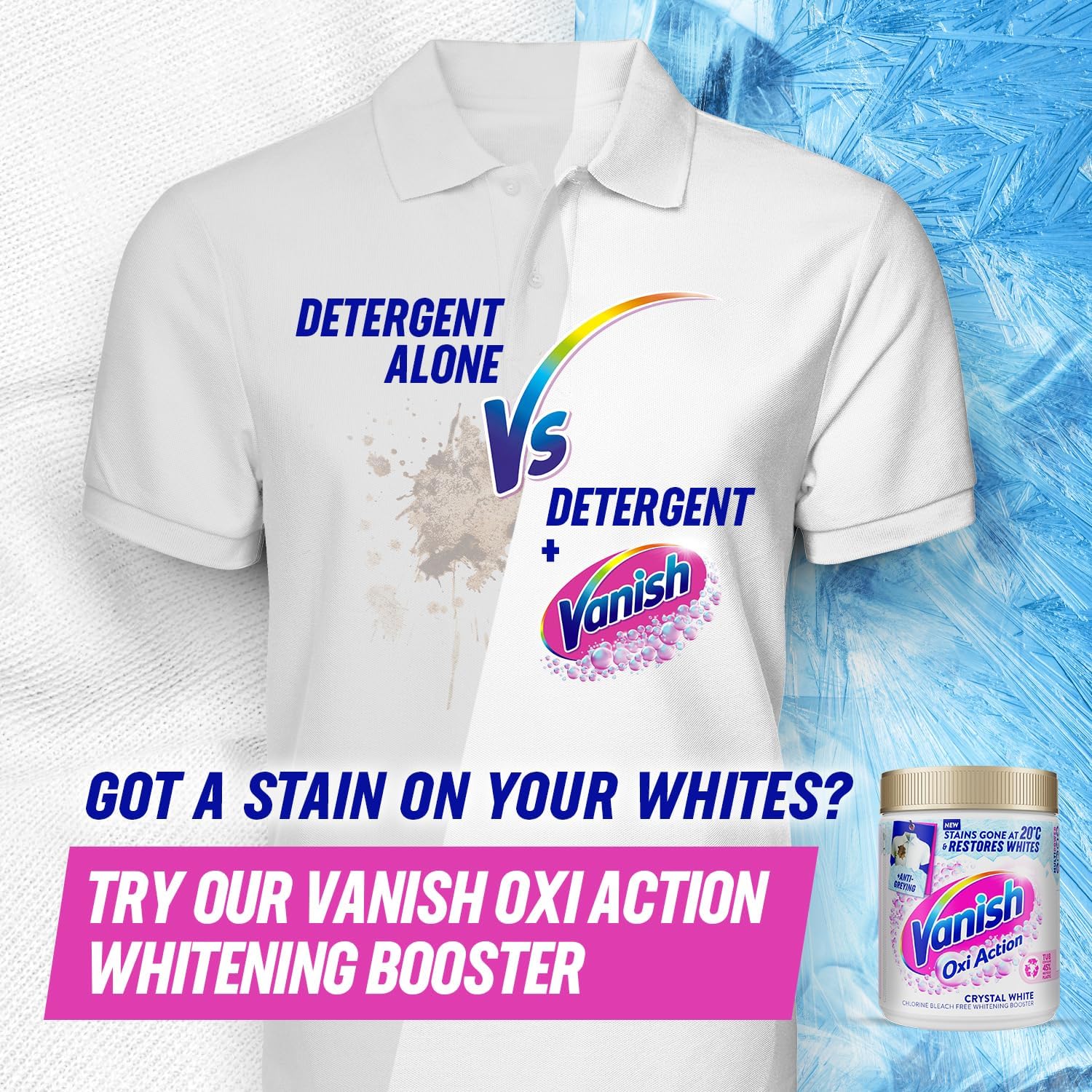 Vanish Gold Oxi Action Stain Remover and Laundry Booster Powder is the UK's #1 stain remover, trusted to tackle tough stains like coffee and wine even in a cold 20°C wash and a quick 30-minute cycle. Its powerful, chlorine-free formula delivers a deep hygiene clean while helping to prevent colour transfer and eliminate odours from deep within fabric fibres.