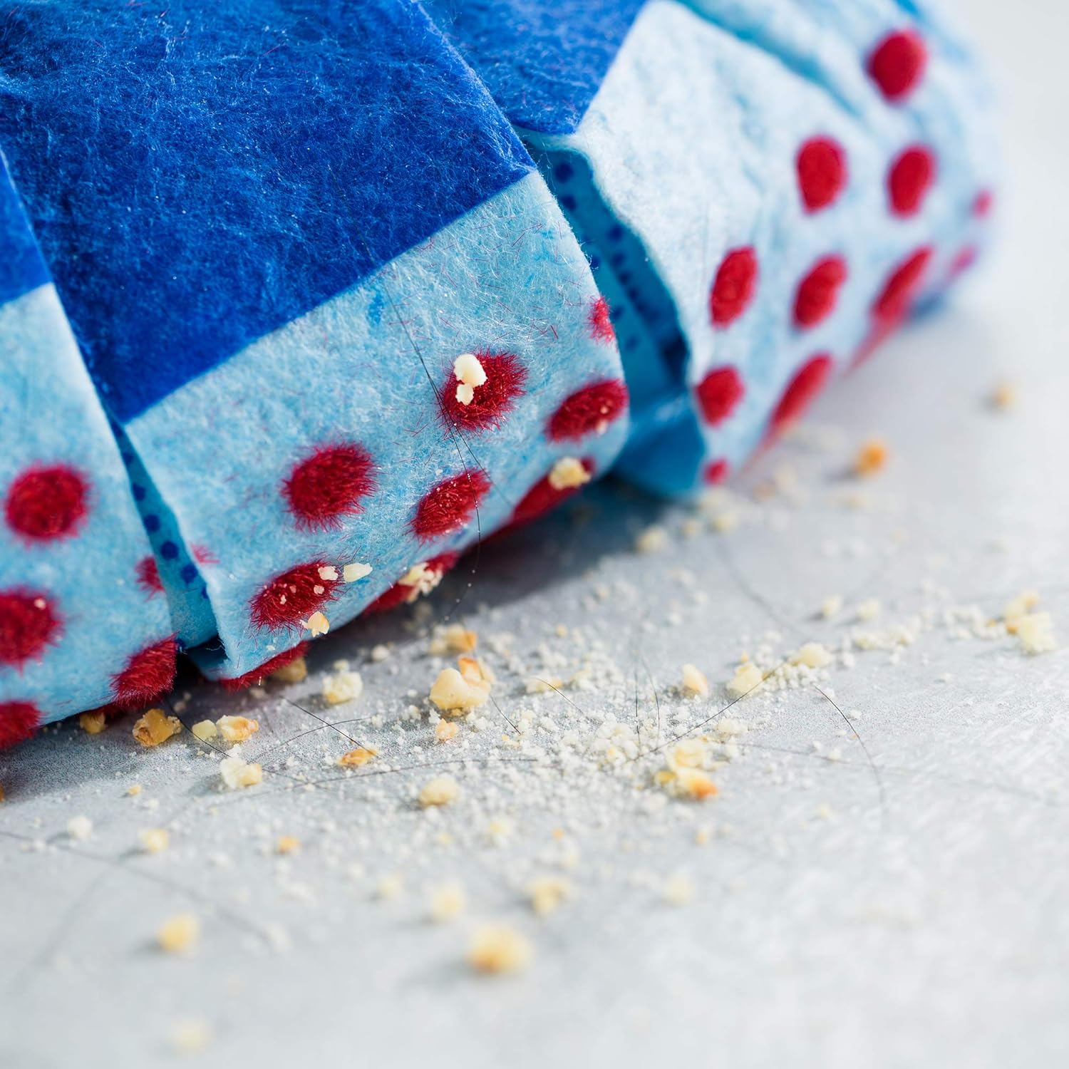 - Three cleaning zones: red non-scratch scourer for tough dirt, blue microfibre for greasy marks, and 3D red smart fibre dots for hair and particle pickup