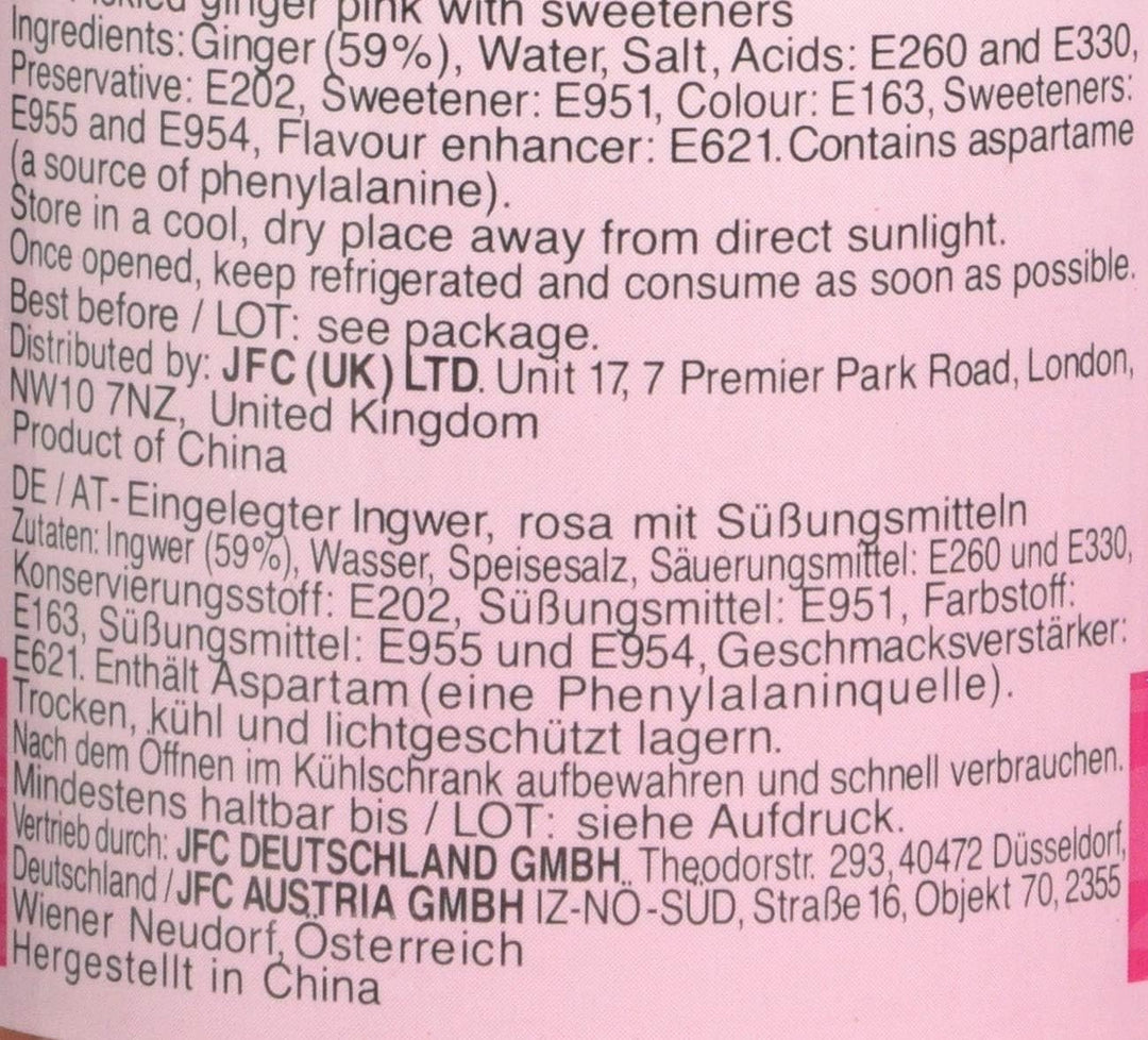 - Colour E163 (natural anthocyanins) – gives the ginger its distinctive pink hue