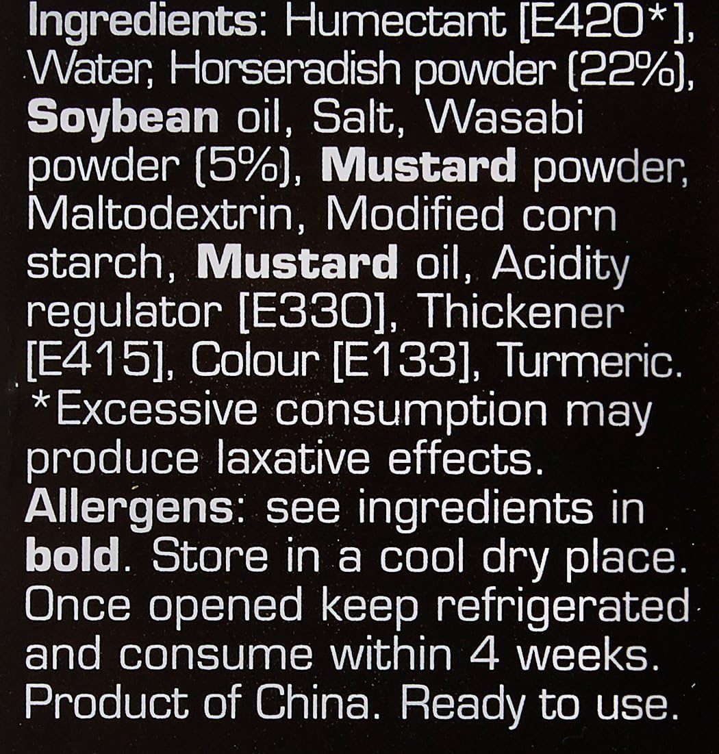 - Ingredients: Humectant [E420], Water, Horseradish (21.7%), SOYBEAN Oil, Salt, Wasabia Japonica (5%), MUSTARD, Maltodextrin, Modified Corn Starch, MUSTARD Oil, Acidity Regulator [E330], Thickener [E415], Colours [E133, E100]